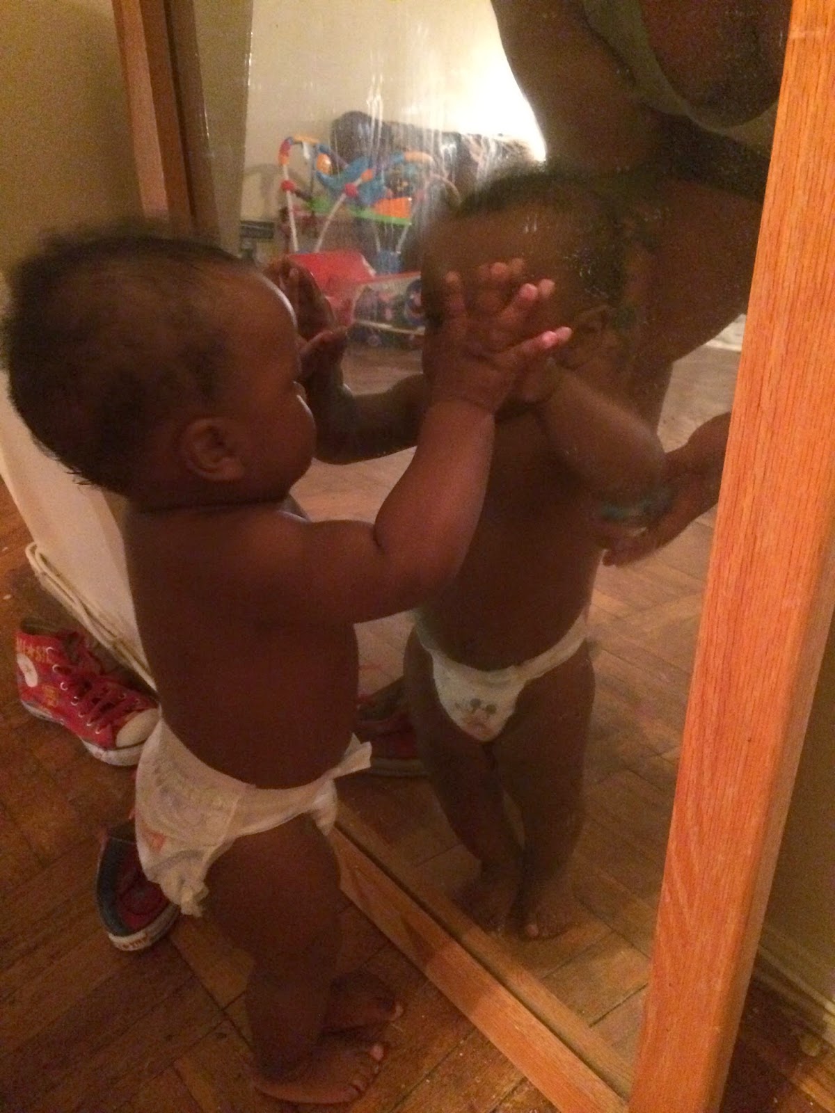 He also loves to stand at first he was wobbly, then he just got stronger and stronger. Now he pulls himself up and stands of course holding on but Its scary for me because I don't think he knows he cant walk. He tries to let go of whatever he's holding or he just starts stepping off. I know one of these days he will be able to do it but Im not sure what his rush is lol. He's probably eager to run and play his sisters. I just have to always keep a close eye on him, I don't need him falling or getting hurt. Kevin is no help all he says is HOORAH!! "Hoorah" whatever! I don't want my baby falling but Daddy isn't worried only me.... :-(